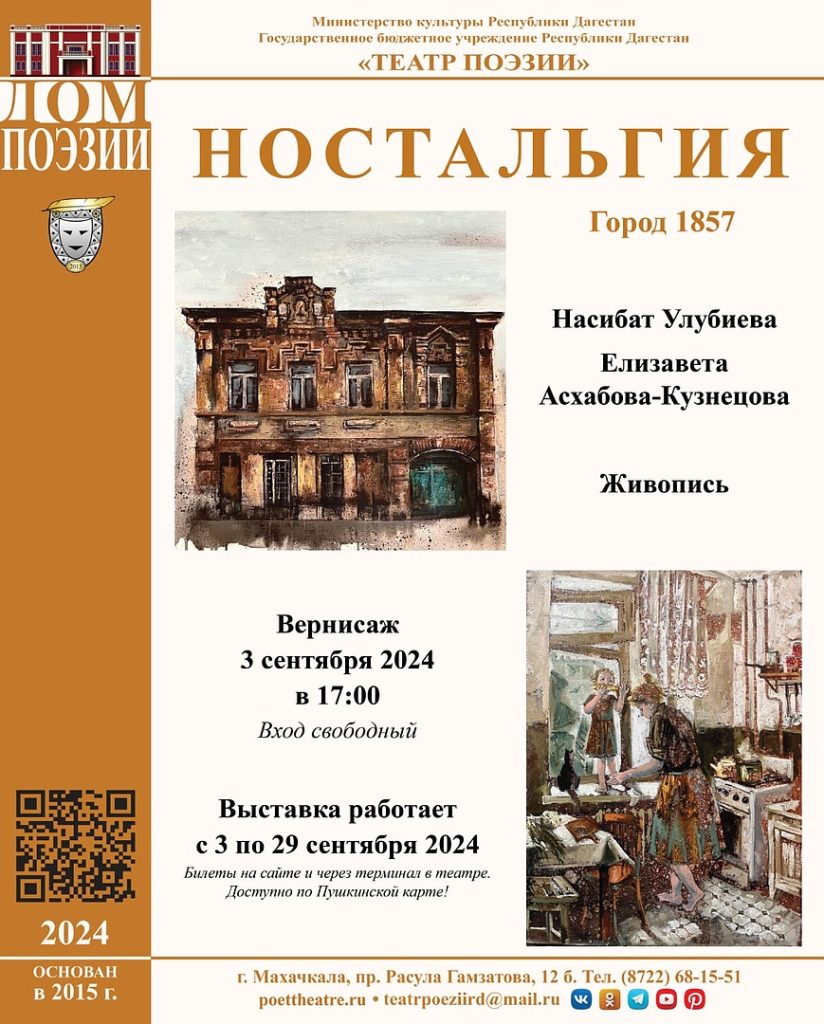 Персональная выставка «Ностальгия. Город 1857» посвящена родному городу художниц – Махачкале (до 1921 называвшейся Порт-Петровском), старым улицам и дореволюционным зданиям, горожанам и духу прежней Махачкалы. В произведениях отразились десятилетия жизни города, стремительно исчезающая старая архитектура, с любовью и теплотой показаны жители и их повседневные занятия. Куратором выставки является председатель дагестанского отделения Творческого союза художников России Екатерина Дидковская.