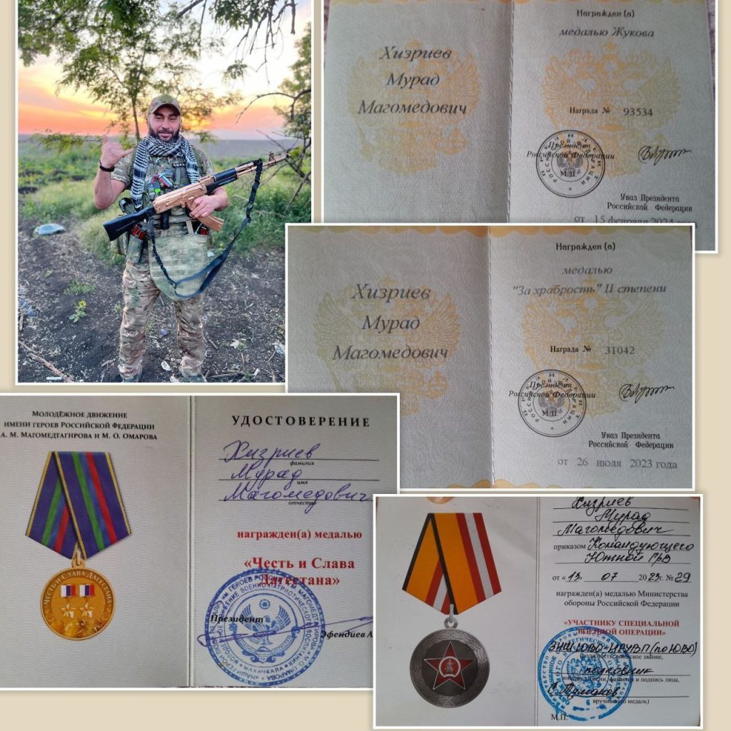 Это медали Жукова, Суворова, «За храбрость» I и II степени (по указу Президента Российской Федерации), «За ратную доблесть», «Участник боевых действий», «Участник специальной военной операции», «За службу на Кавказе», награжден Золотой звездой «Народный герой Дагестана» и «Народный герой Кавказа», внутренними наградами ЧВК «Вагнер» «Участнику военной операции в Сирии», отдельная медаль Группы Вагнер «За взятие Попасной», а также отмечен нагрудным знаком «Гвардия» и ведомственным знаком отличия ЧВК «Черный крест».